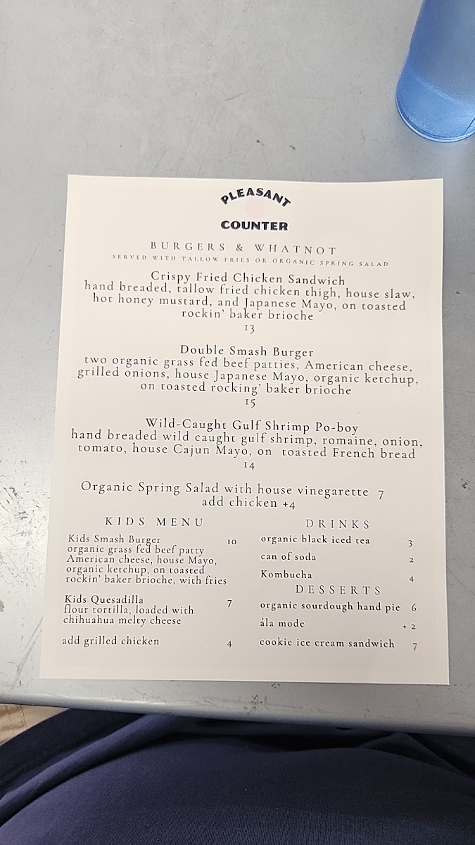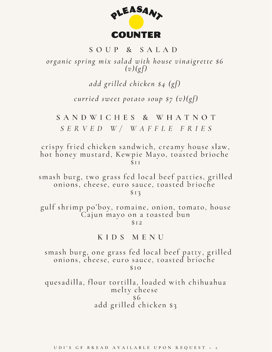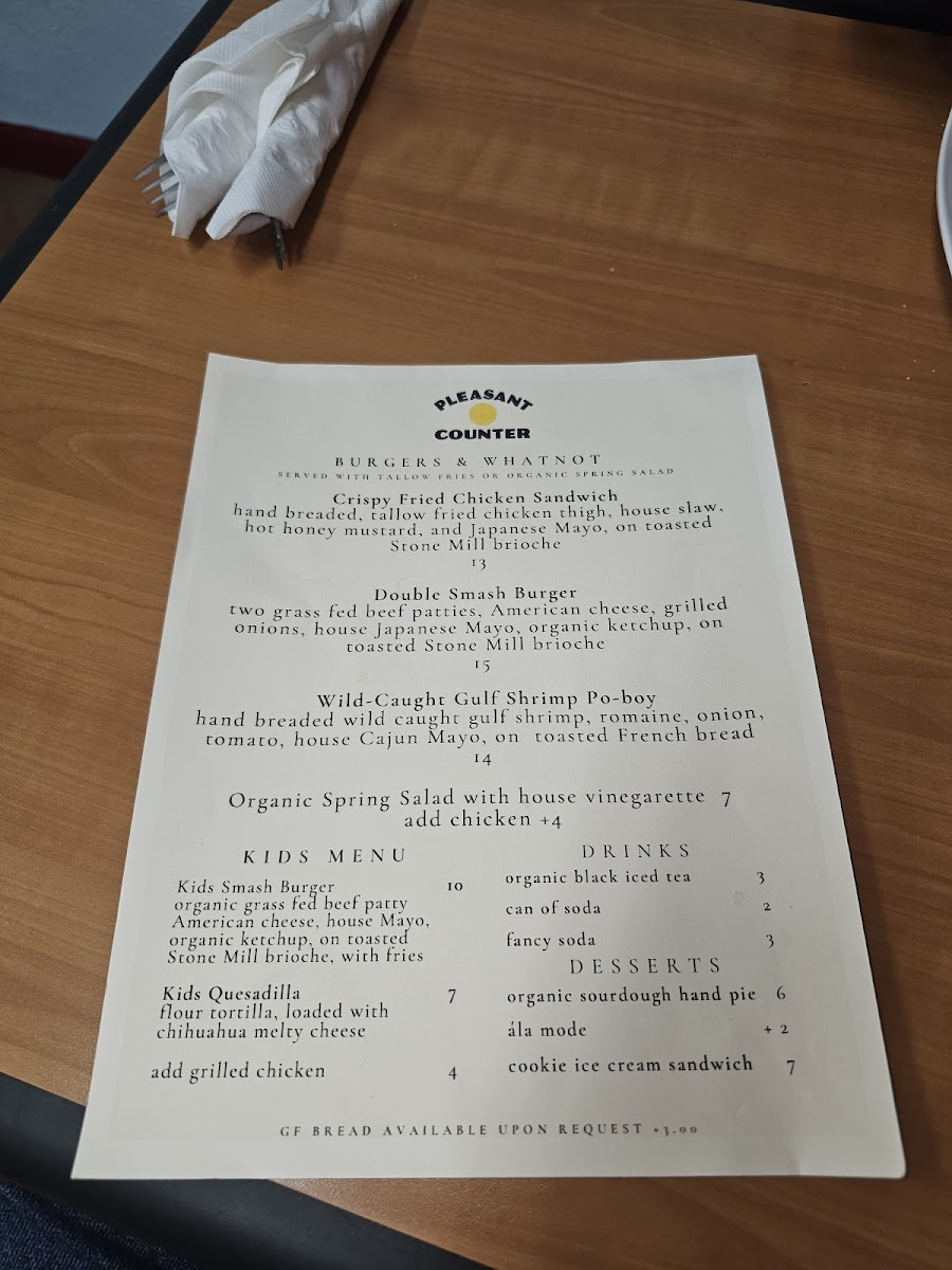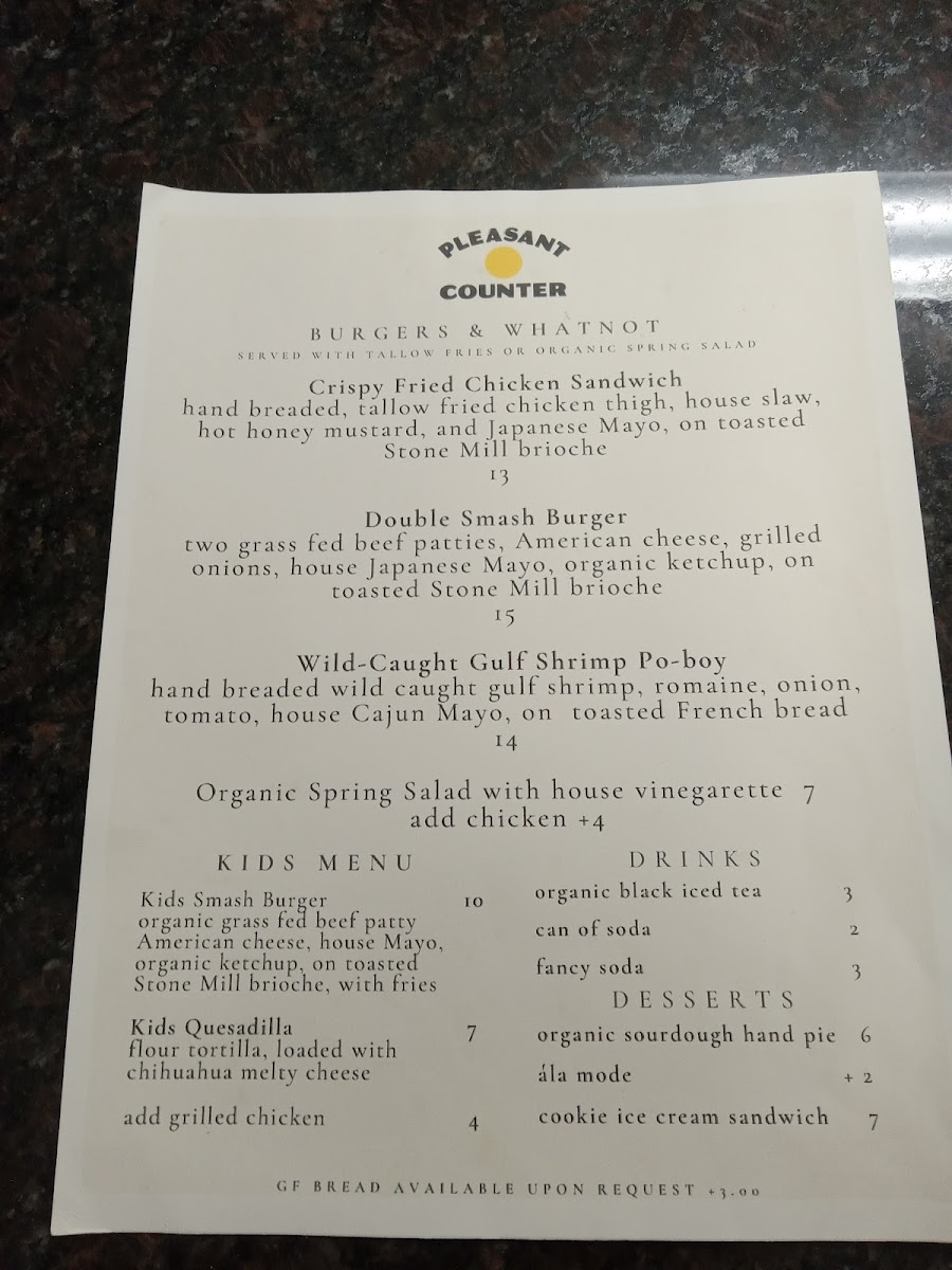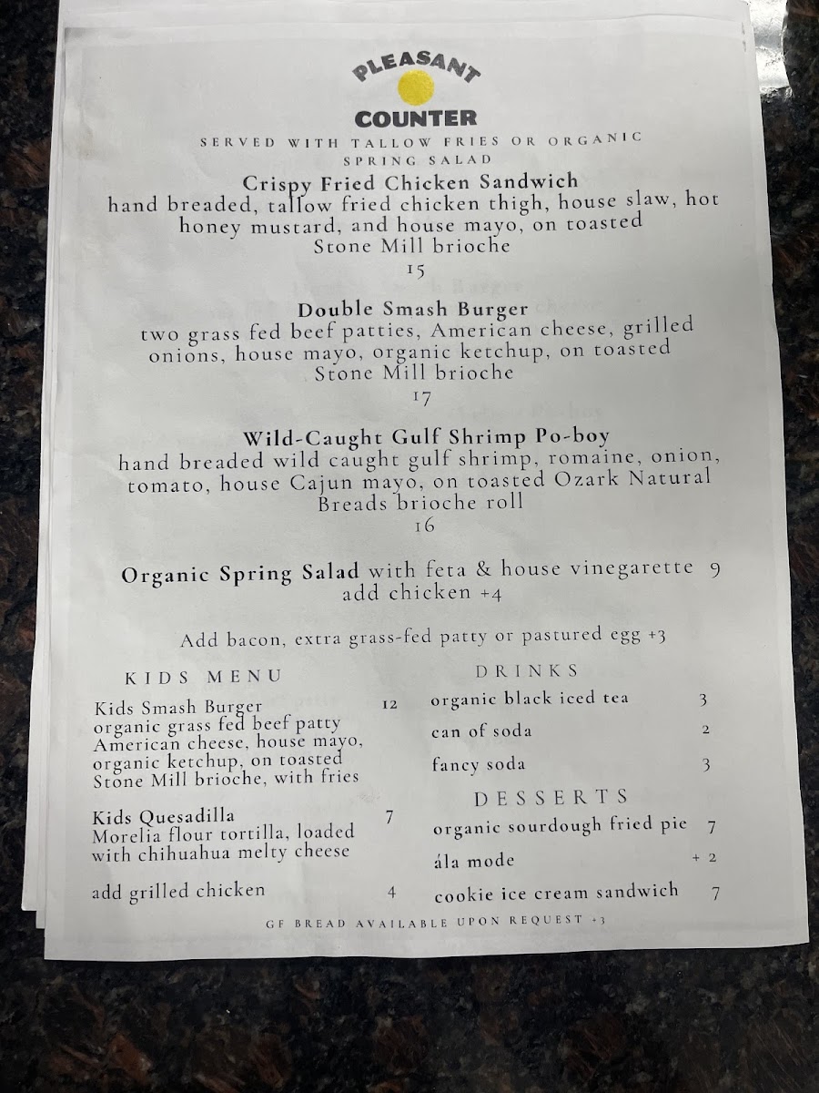 At Pleasant Counter, located at 907 S Pleasant St, Springdale, AR, the menu offers a delightful variety of dishes, each crafted with fresh, high-quality ingredients. Their Burgers & What Not section is particularly appealing, featuring a delicious Double Smashburger alongside lighter options like the Organic Spring Salad. If you're craving something a bit more indulgent, the Wild-Caught Gulf Shrimp Po-Boy and the Crispy Fried Chicken Sandwich are both standout choices that will satisfy any appetite.
